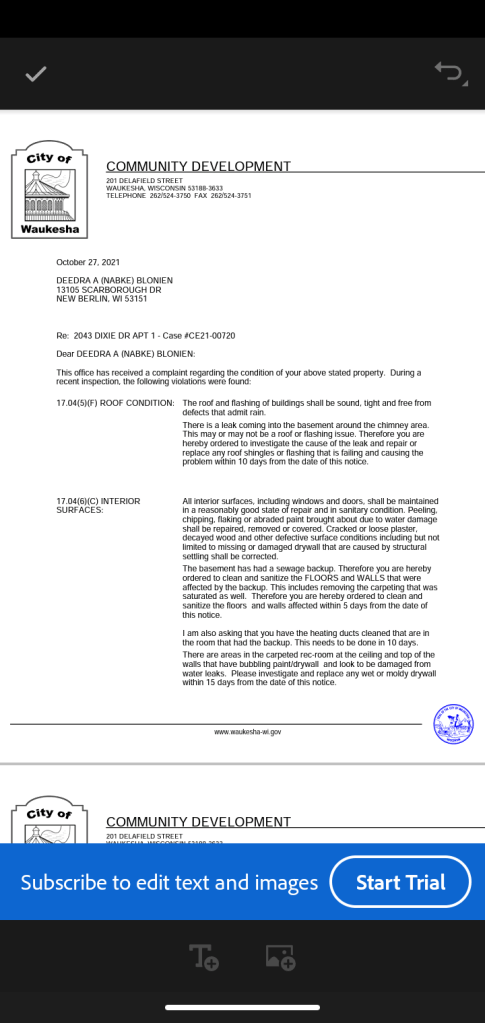 It was clear at that time that the employee was lying too the tenent when told ” everything looks good on this end ” , The city of Waukesha does not want to be negligent so what do they do ? ‘Nothing ? ” So now they are even more negligent , there has now been a civil right complaint with a micro SD card filled with 100 or more time stamped photo’s tons of Emails between the property maintenance inspector and tenent clearly showing negligence , text message‘s , between Ok landlord and tenant . Undisputed evedence .