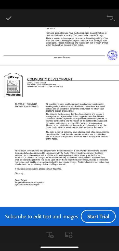 The Document below is an order by the City of Waukesha Wisconsin Property Maintenance inspector ( Angie Grover ) if you read the order it sounds great only now believed to be a front for the tenent D because the Sewer pipes are municipal and There City Of Waukesha Wisconsin is very negligent as well as her Landlord . So instead of help D the had something going on the side with the Landlord which we are still trying to figure out.